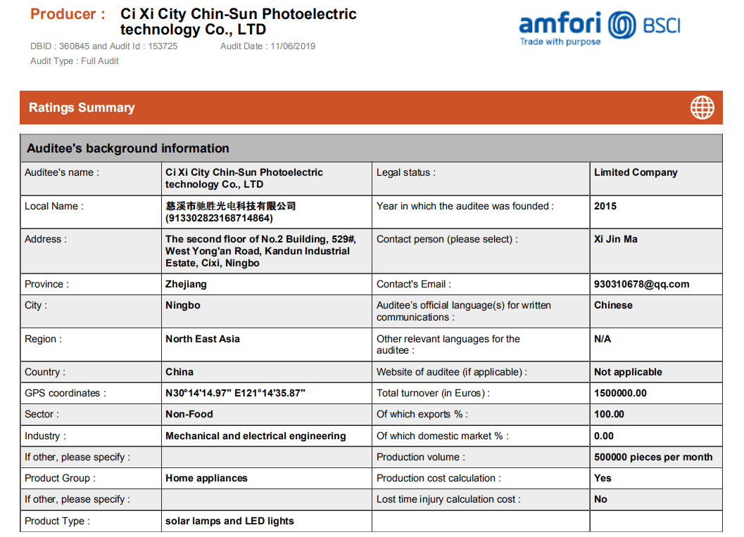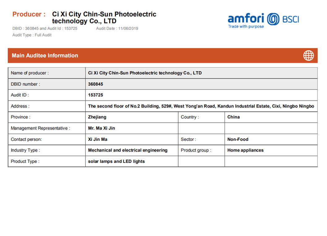 余姚市骏升工贸有限公司坐落于浙江省余姚市低塘工业区,距离著名的杭州湾跨海大桥30公里,交通便利,环境优越,经济繁荣,我司专业生产加工太阳能园林灯、电子蜡烛灯、遥控电子灯、户外景观灯、五金塑料工艺品、其他室外照明灯具等产品,公司拥有完整、科学的质量管理体系。 工厂已拥有BSCI认证,所有产品均有CE&ROHS认证。
